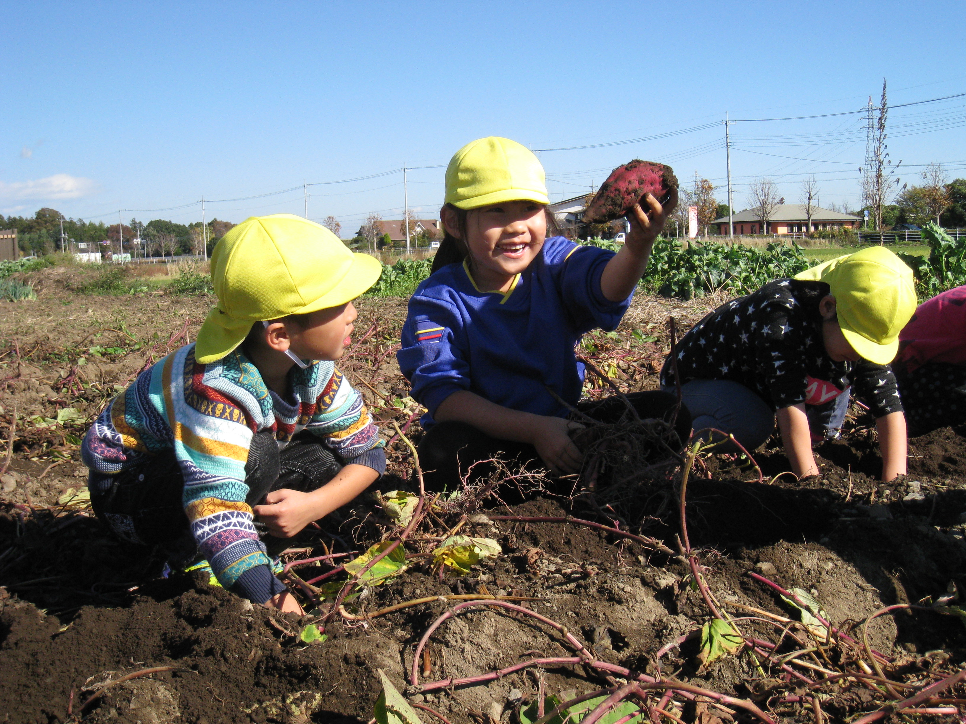 5月に苗を植えたさつまいもを掘りました。「大きいおいもができたかな?」「おいしいおいもになったかな?」と、宝探しのように土を掘り、ゴロゴロとさつまいもが出てくると大喜びの子ども達でした。みんなのさつまいもも、給食とおやつに出ます。愛情たっぷりのさつまいも、きっと美味しいと思います!!
