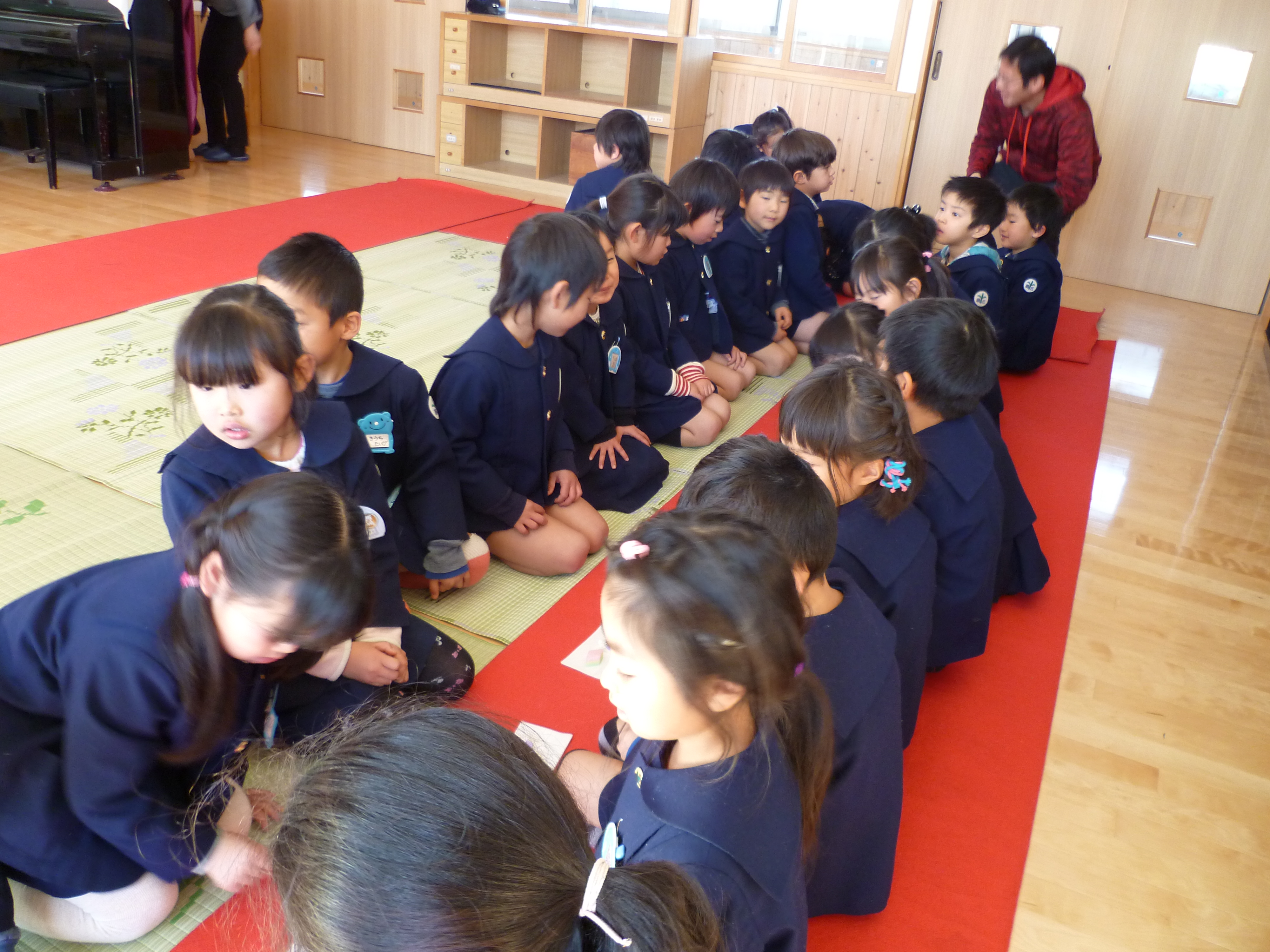 2/4(水) 年長さんがお茶会に参加してきました。茶道の先生や保護者の方に協力していただき、日本の作法に触れることが出来ました。初めてのお茶会にちょっぴり緊張気味の子ども達でしたが、おいしい抹茶やお菓子をいただき、笑顔も見られました!