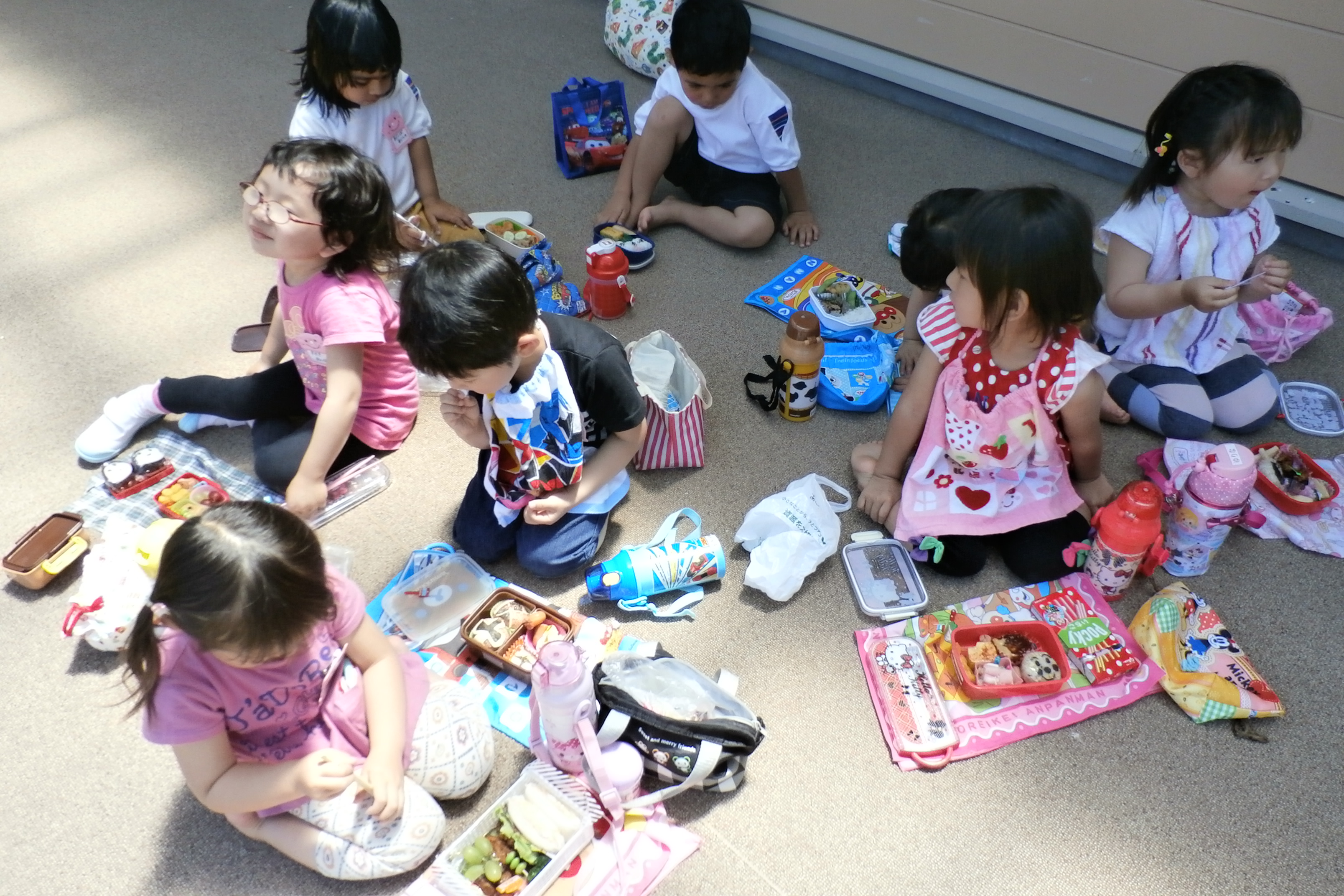 園に戻ってきて、待ちに待ったお弁当の時間!手作りお弁当をおいしそうに食べていました。