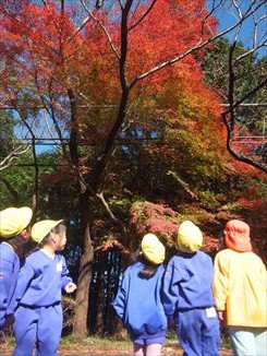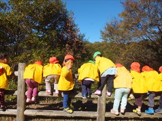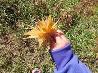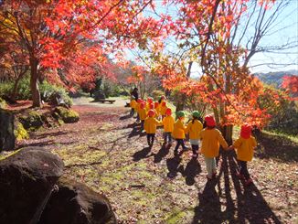 さくら組・年少さんは、バスに乗って根本山上の広場まで!どんどん登っていくと、キレイに染まったもみじを見つけて、大興奮♬