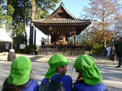 また今日は、近くの大前神社で新嘗祭 大大神楽奉納があり、保育園の年長さんが歩いて見学に行ってきました!