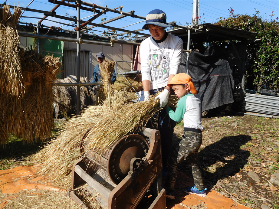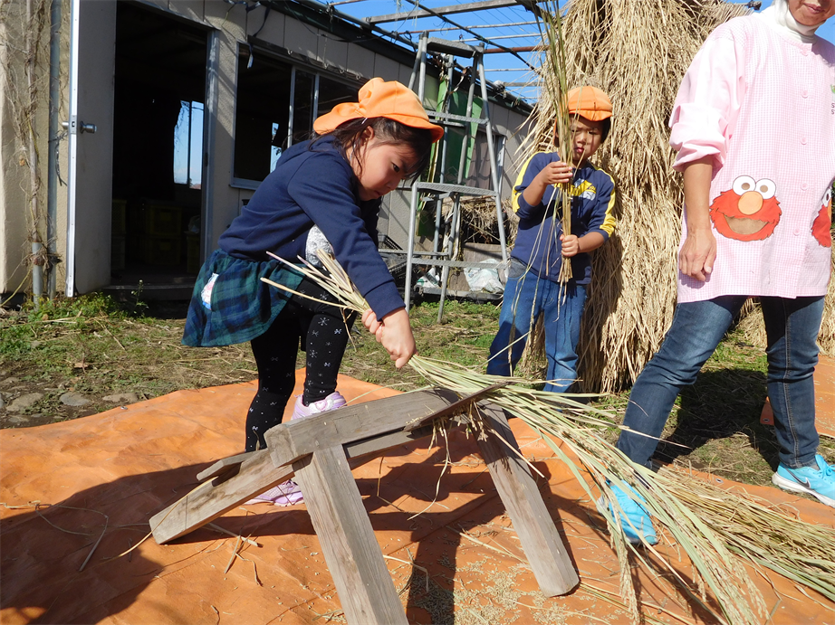 11/17(木) 脱穀体験 『年長さんの田んぼでとれた黒米を千歯こき&足踏み脱穀機を使って脱穀しました』初めての体験で思わず、「おぉぉぉ~」と声が漏れていました