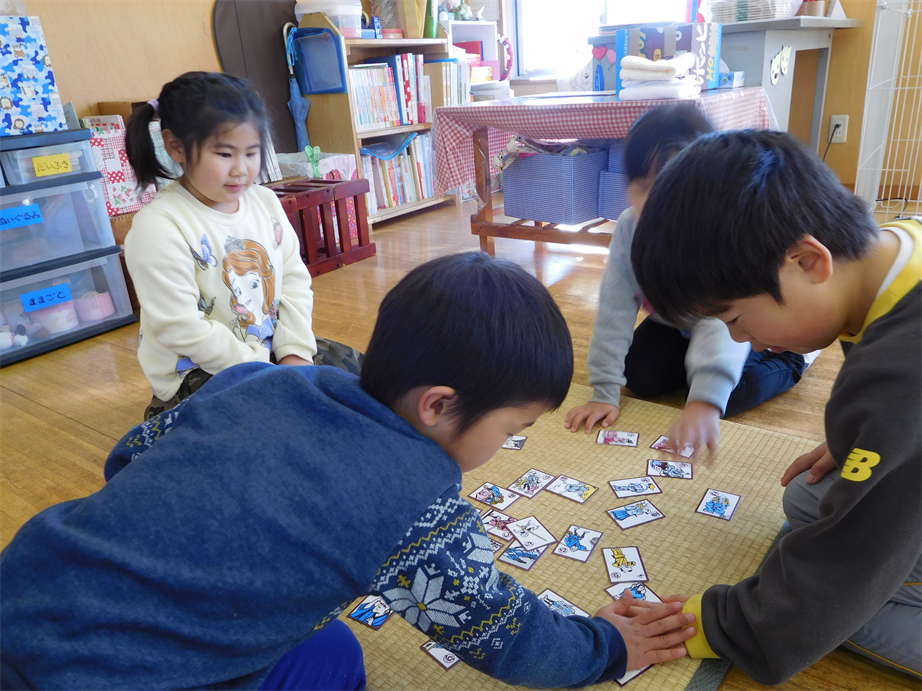 年長さんは白熱した接戦を繰り広げ、年中さん・年少さんも文字に親しみながら、楽しんでカルタとりをしていました![]()