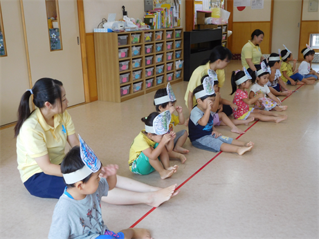 年少さんはお面を付けて『ザリガニチョッキン』を踊りました✌