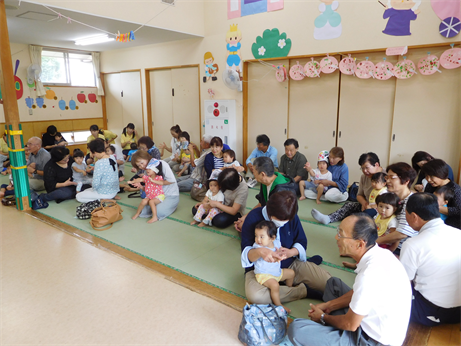 ひよこ組さんもおじいちゃん・おばあちゃんの膝の上で手遊びを楽しみ
