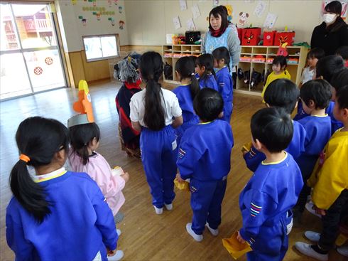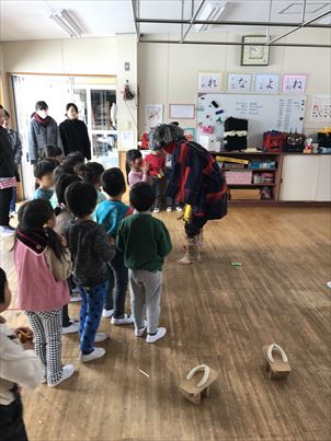 年少さん、年中さん、年長さん全員で豆まきをして