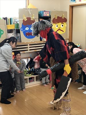 それでも保育者と「おにはそと~ふくはうち~」と言って豆まきをし、