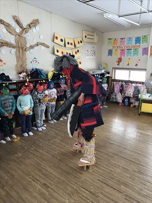 小さいクラスはお面を付けて準備ばっちりでしたが、