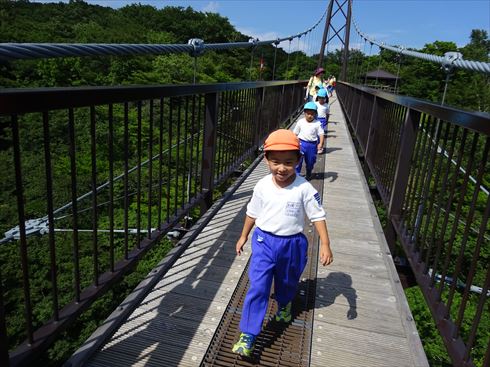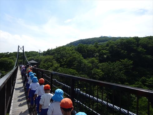 揺れる吊り橋に喜んでいる子もいれば、『怖いからジャンプしないでよ