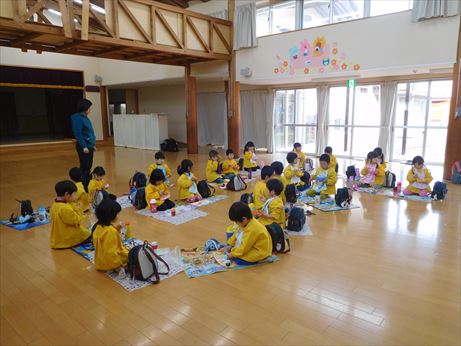 お昼は自分のシートを広げてホールでお弁当をみんなで食べました
