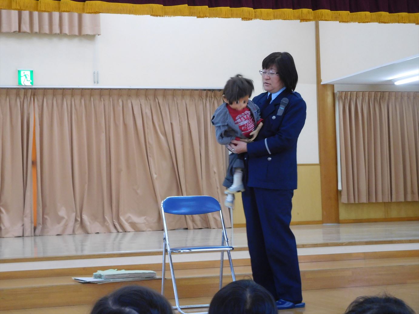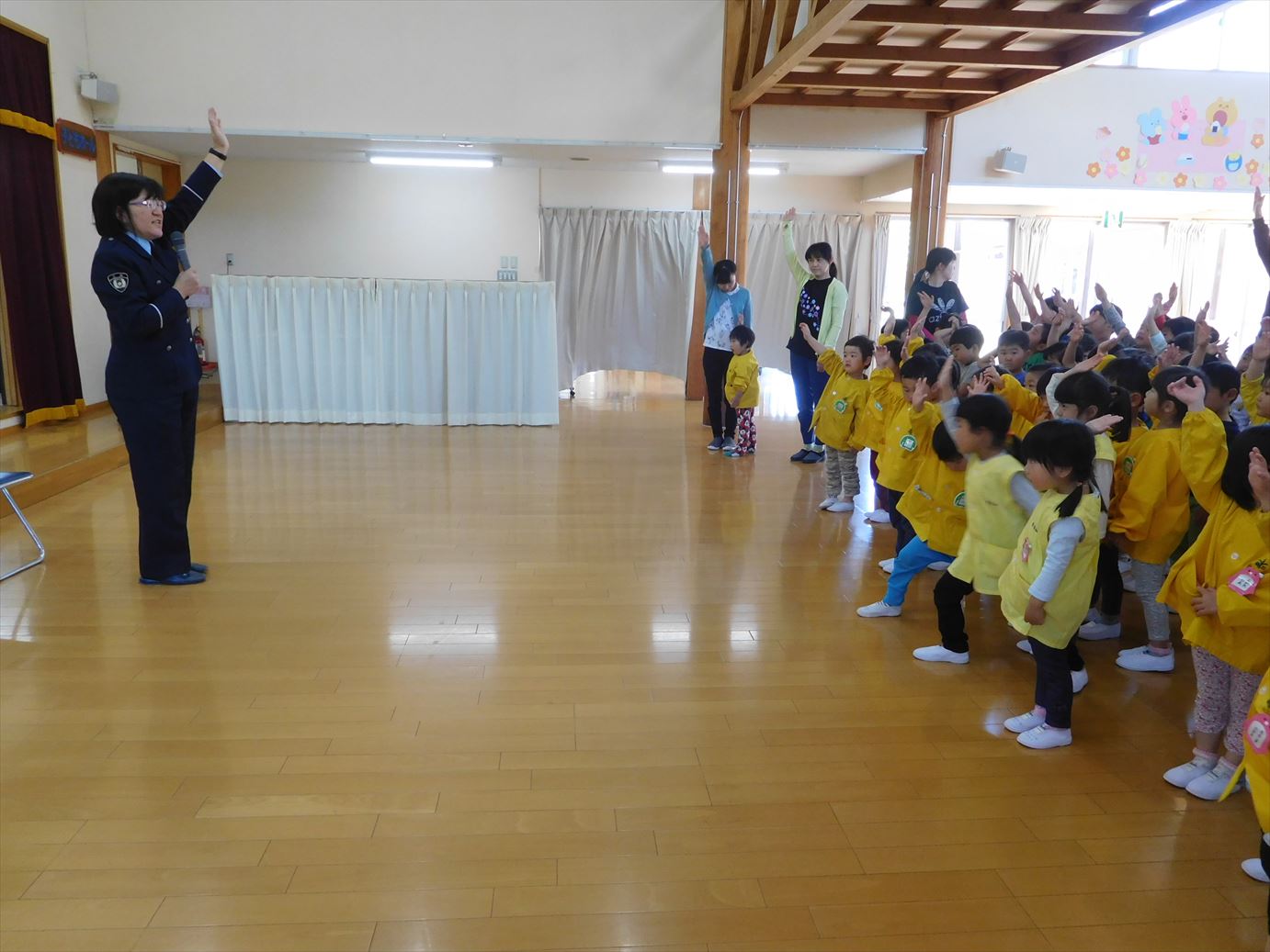 いつもたのしく分かりやすく交通ルールを教えてくれる高木指導員さんが今回も来園して下さいました。横断歩道の渡り方や車に乗る時の約束などを子ども達と一緒に確認しながら、お話をしてくれましたみんな待っていたケンちゃんも来てくれて、大喜び\(^o^)/✨