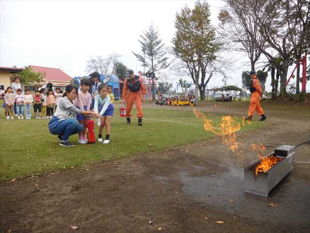 年長さんは、消火器の使い方も教えてもらい、実際に体験しました![]()