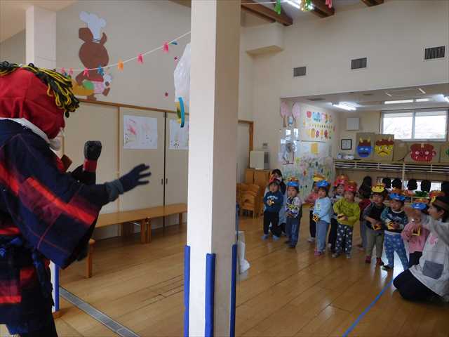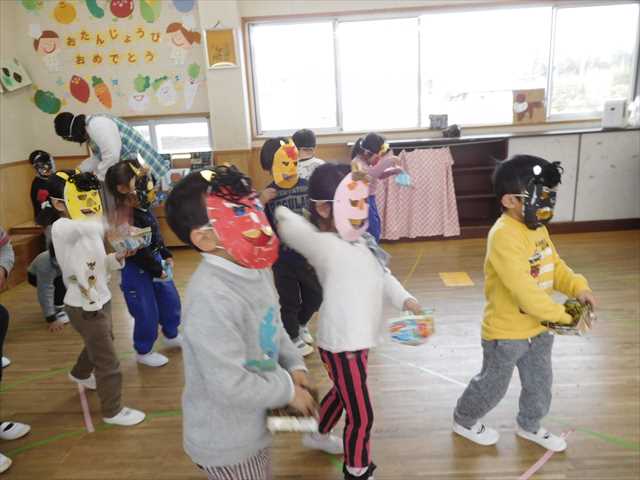 『こわい』と思いながらも、自分の作ったお面をつけて元気に「おにはそと~!ふくはうち~!」と豆まきをした子ども達でした(´ω`●)(越島・大根田)