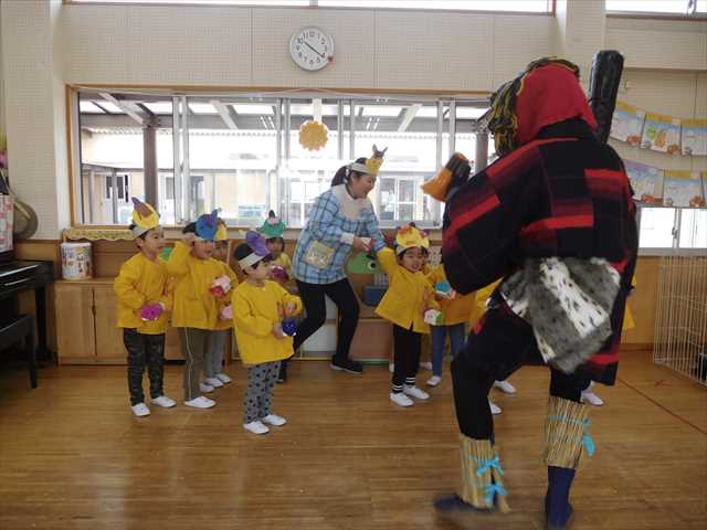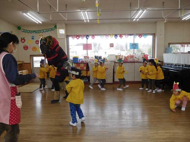 2/3「今日は節分だ!」「おにさんくるよね!?」と朝からちょっぴりドキドキの子ども達( *´艸`)みんなで節分の紙芝居を見て、どうして鬼がくるのか、どうして豆をまくのか、、、など知った子ども達読み終えたころ、、、