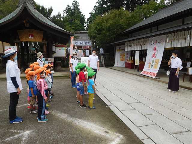 神主さんから、伝承話でも伝わっている『茅(チガヤ)』を身に付けていると健康に過ごせることを聞いた子ども達少し難しい話でしたが大きな茅の輪を見ながらよく話を聞いていました