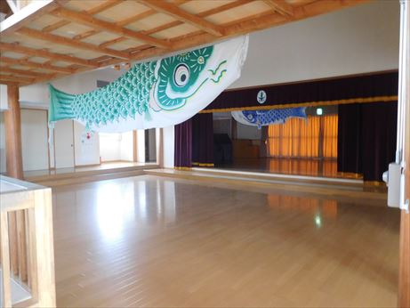 園庭を泳いでいた大きなこいのぼりがホールにやってきました