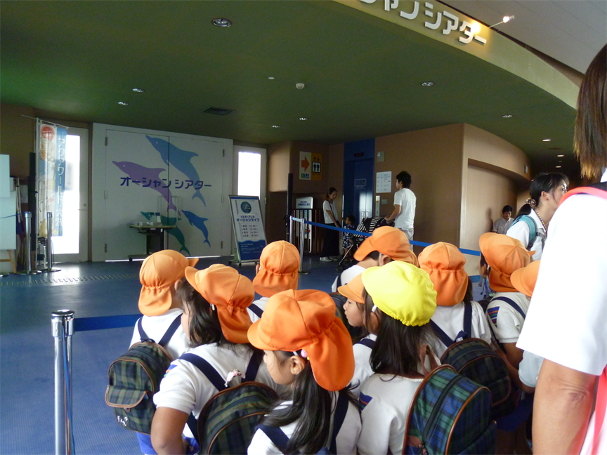 水族館に着いてさっそくイルカのショーの順番待ちです。「まだかな、まだかな」と待ち遠しい様子