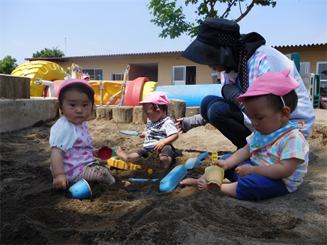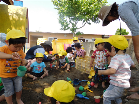 天気の良い日は、砂場遊びヽ(^。^)ノ初めは、砂の感触に何とも言えない表情をしていた子ども達も今となっては夢中になって遊んでいます。