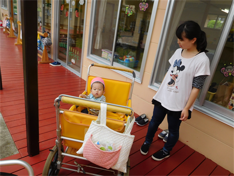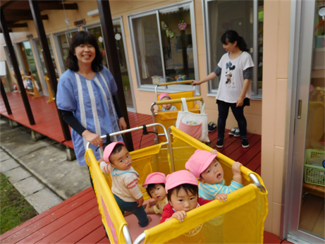 0歳児(ひよこ組)さんは、みんな仲良くバギーに乗ってお散歩♪