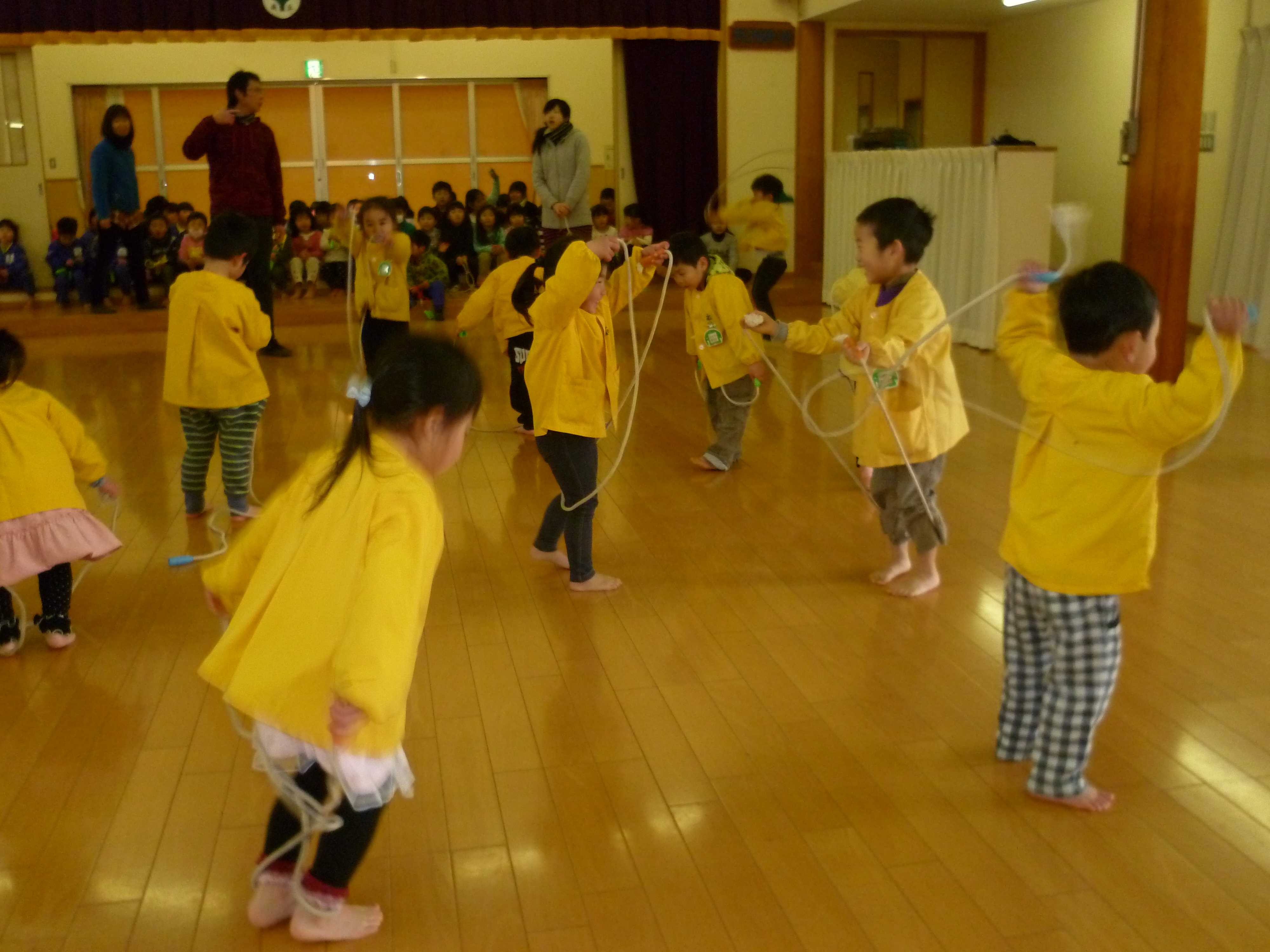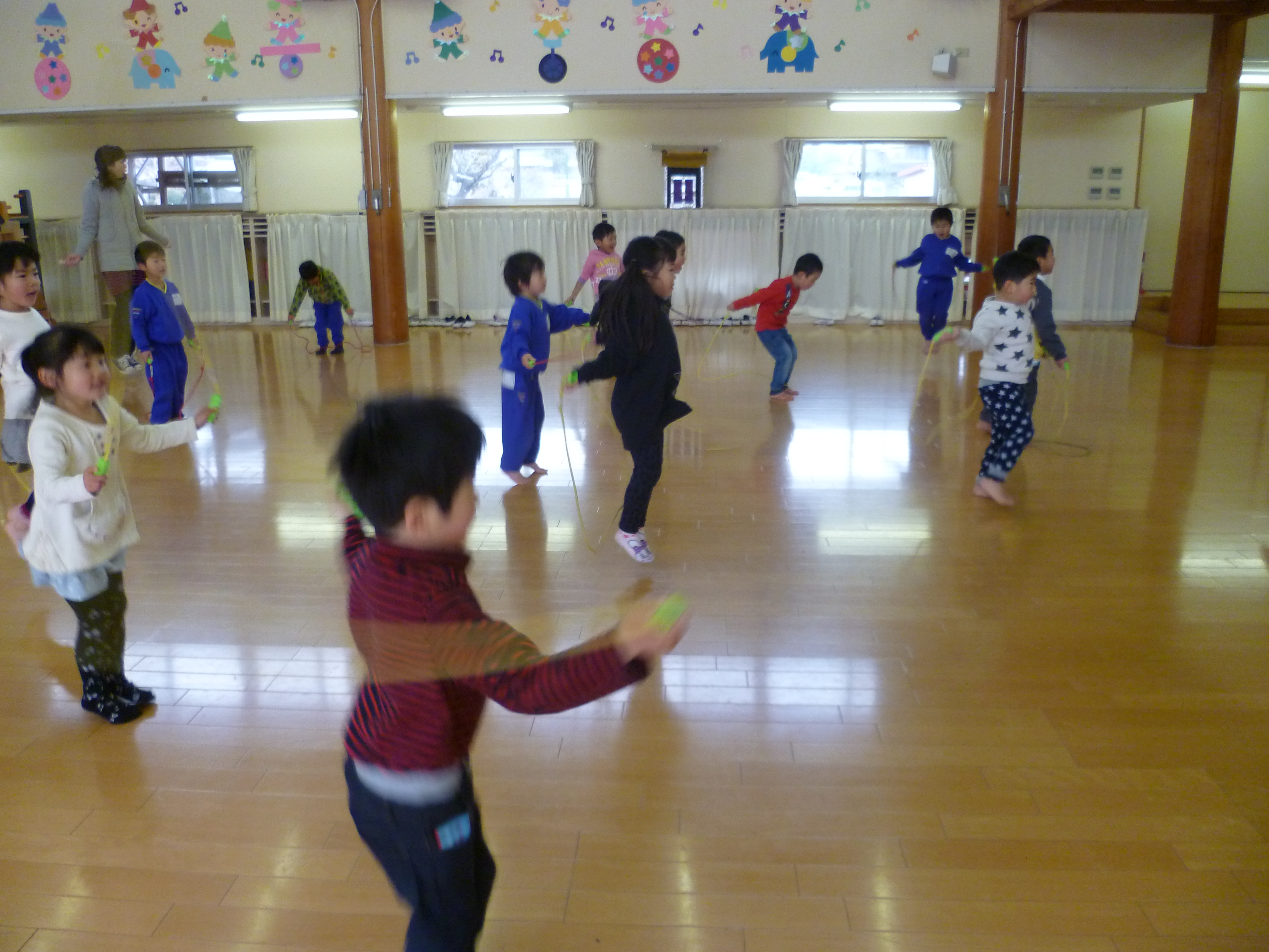 1/20(火)なわとび大会がありました。対象は年少児・年中児・年長児です。毎朝なわとび集会に参加したり、体操教室で練習したり、自由遊びの時間にも跳んだりと頑張っていた子ども達。なわとび大会当日も100回、500回、1000回、、、と自分の目標に向かって行う姿が見られました。