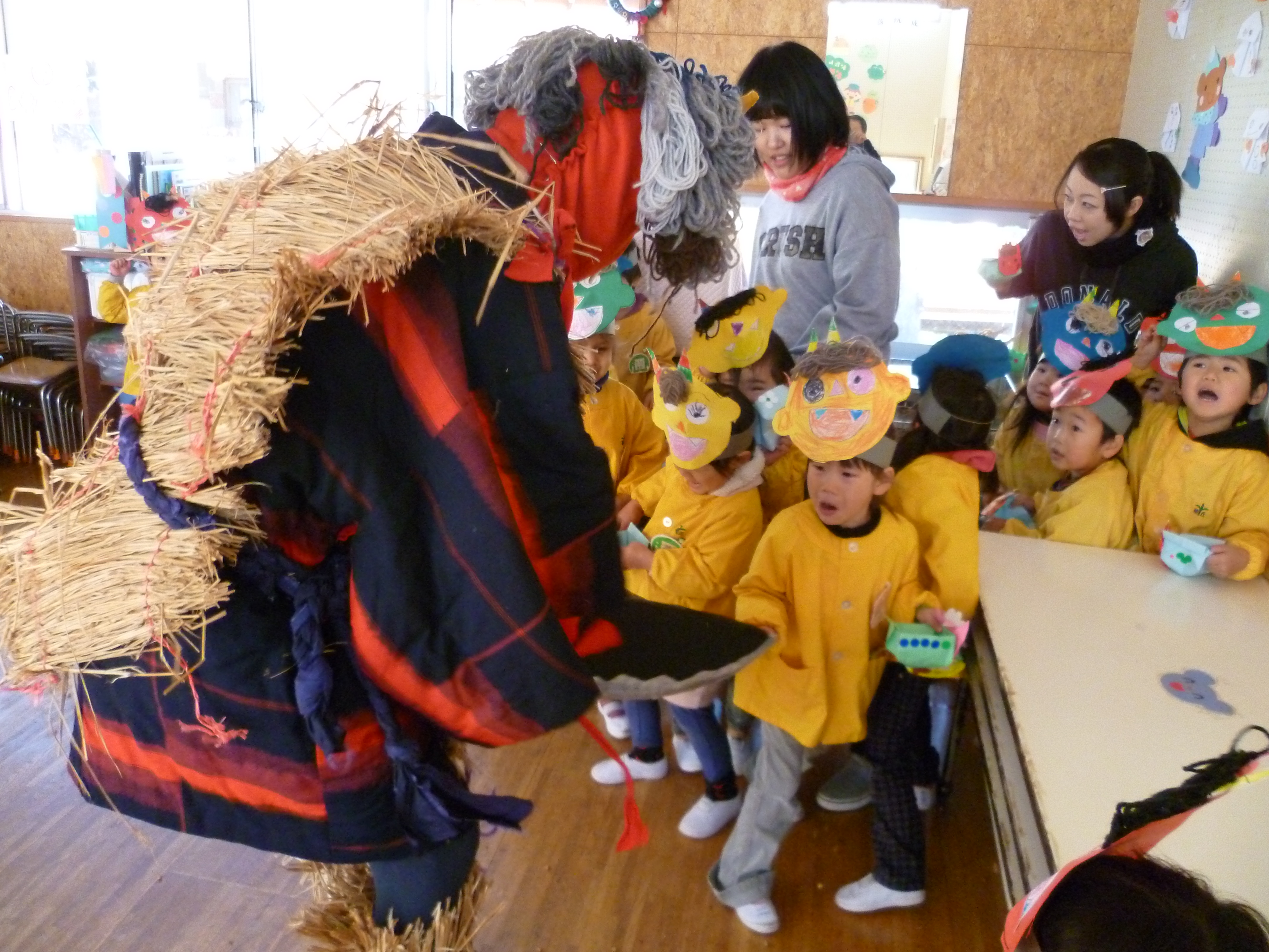 2/3(火) 東保育園、幼稚園の節分の日には「泣き虫はいないか~」「弱虫はいないか~」と鬼さんがやってきました。子ども達は、自分で作った鬼のお面と豆入れを持って、震えながらも「おにはそと~!ふくはうち~!」と豆まきをしました。