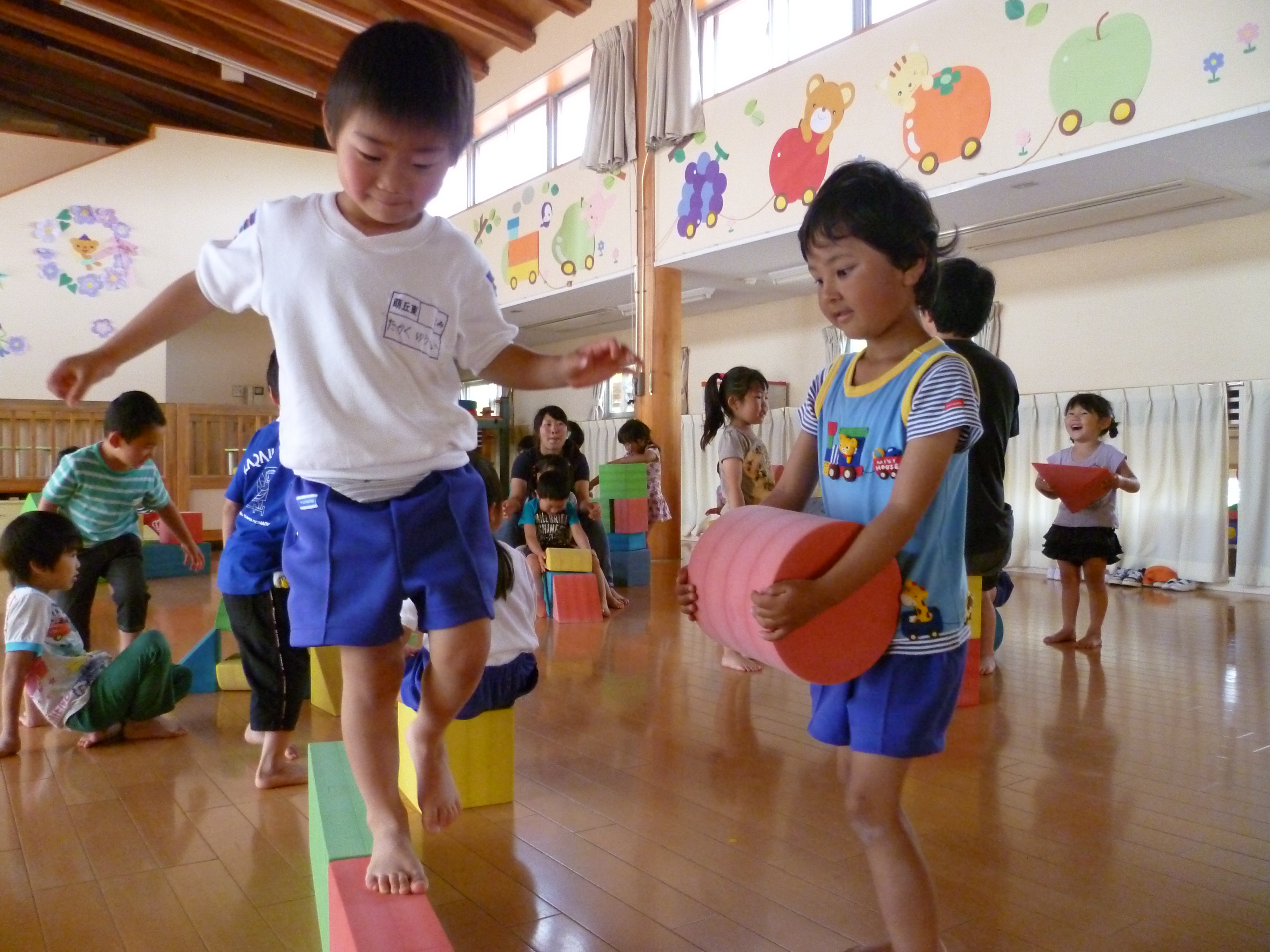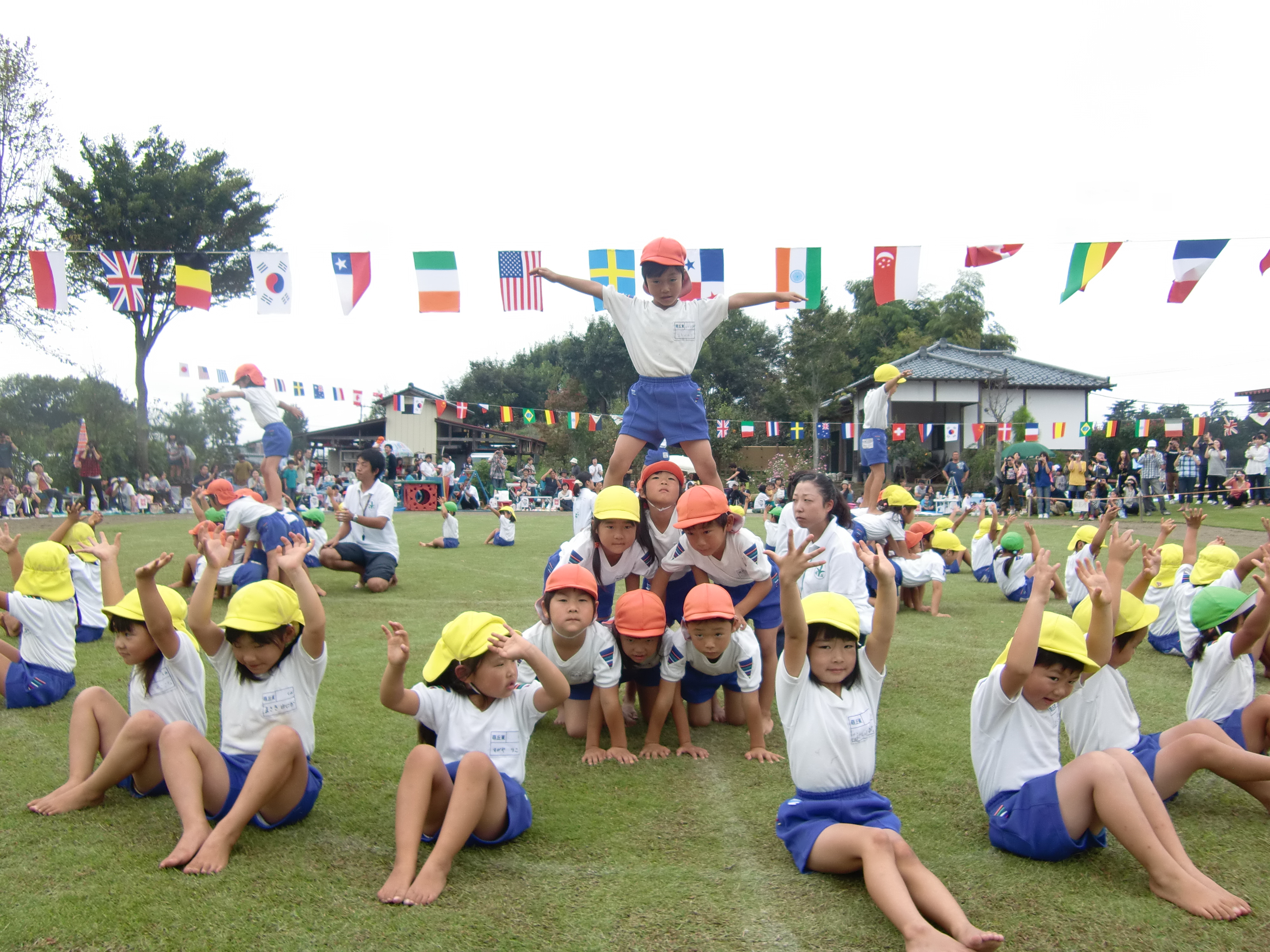 東園の運動会は、園の特色でもある“裸足”で行っています。今回もみんな裸足で、かけっこや障害走、お遊戯など元気いっぱい体を動かしました。緑に囲まれた気持ちの良い環境です!!