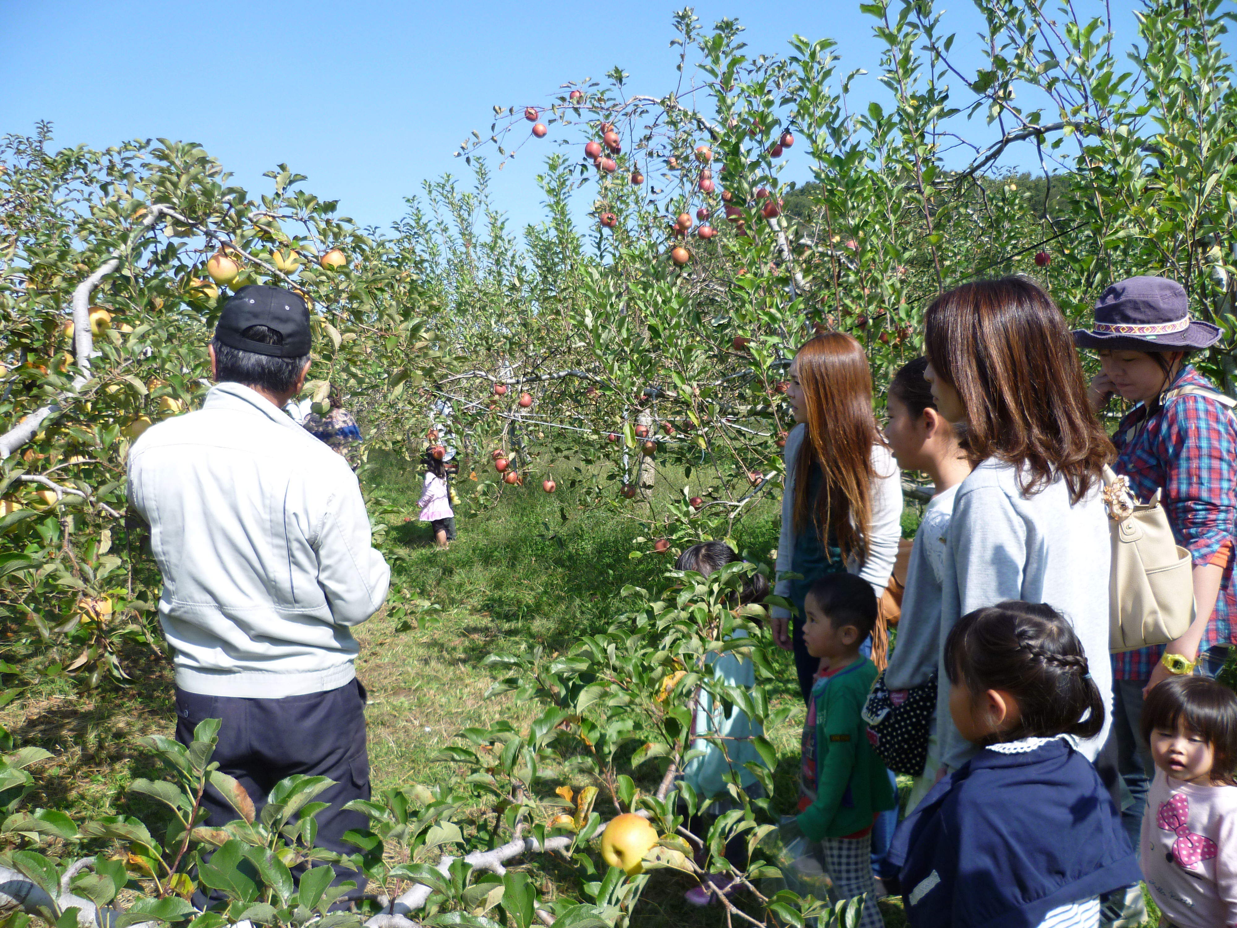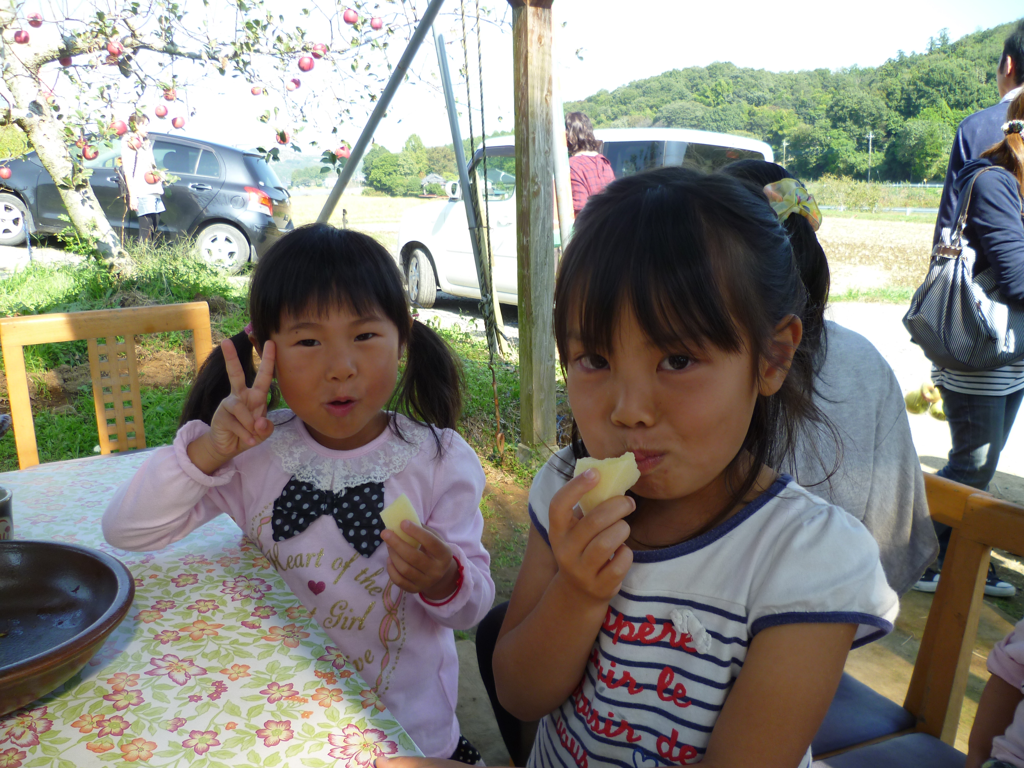 10/18(土) 家庭教育学級で益子町の広田果樹園さんにお世話になり、りんご狩りをしました。田園広がる自然豊かなところで、おいしい空気を吸いながら、旬のおいしいりんごをたくさん獲ることができました。大好きなりんごを目の前に、子ども達も満面の笑み!保護者の方と一緒に嬉しそうにりんご狩りをする姿や、お友達と広い田んぼ道を駆け回る姿などが見られ、とても楽しそうでした。