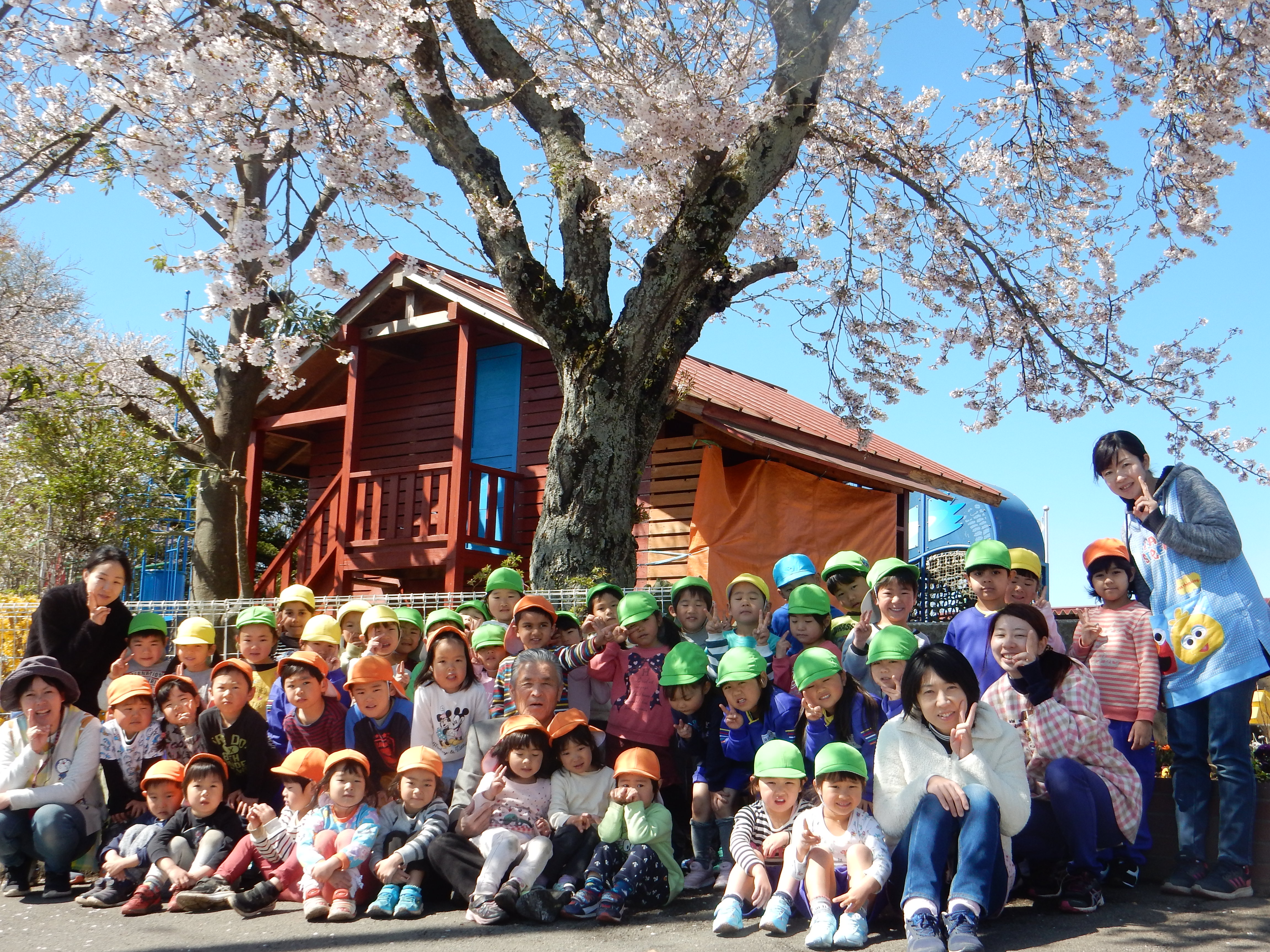 東園の大きな桜の木の下で理事長先生と一緒に写真を撮りました